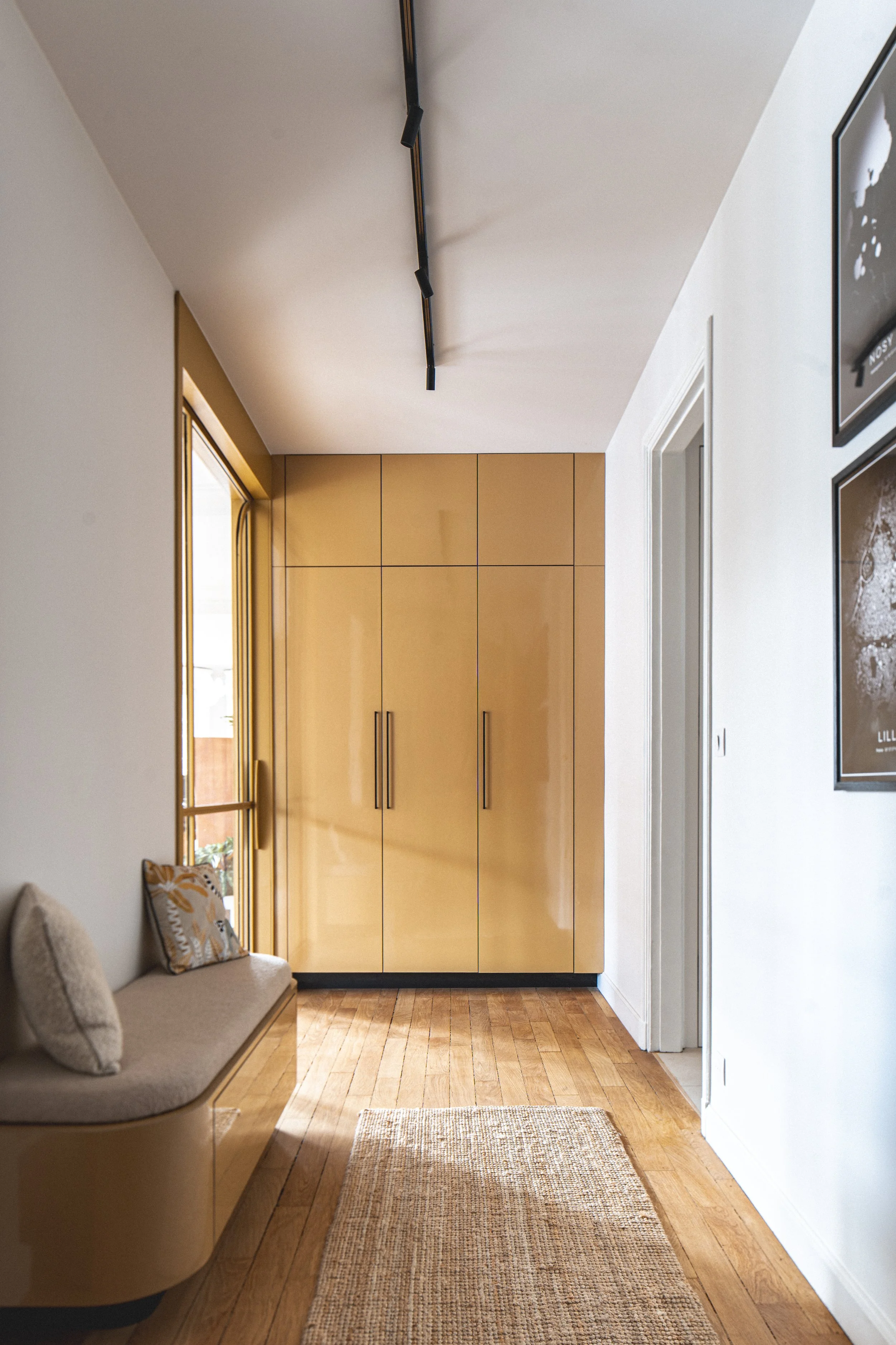 Réinterprétation organique du style haussmannien, cet espace de 200 m² s'articule autour d'une pièce à vivre magistrale de 90 m². La lumière traversante y souligne une hauteur sous plafond exceptionnelle et des menuiseries sur mesure aux lignes galbées, signature du lieu. Entre finitions laquées "beurre", marbre vert et laiton brossé, l'appartement propose une esthétique minimaliste teintée de rétro. Un décor aux matériaux nobles : chêne massif, pierre naturelle. Un lieu fluide, graphique et résolument inspirant.