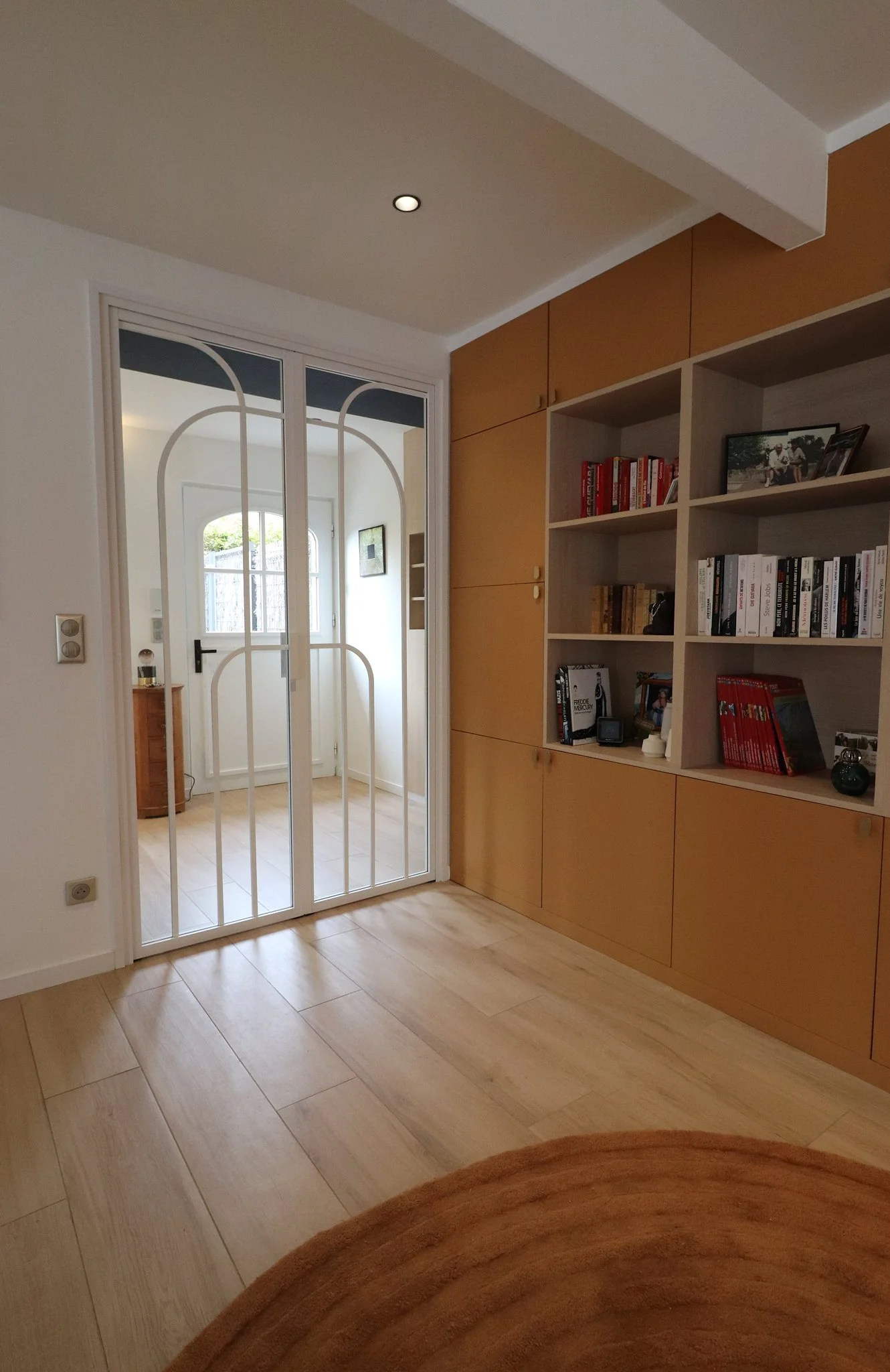 Un mur de rangements sur mesure ocre mat et bois clair structure la pièce de vie.