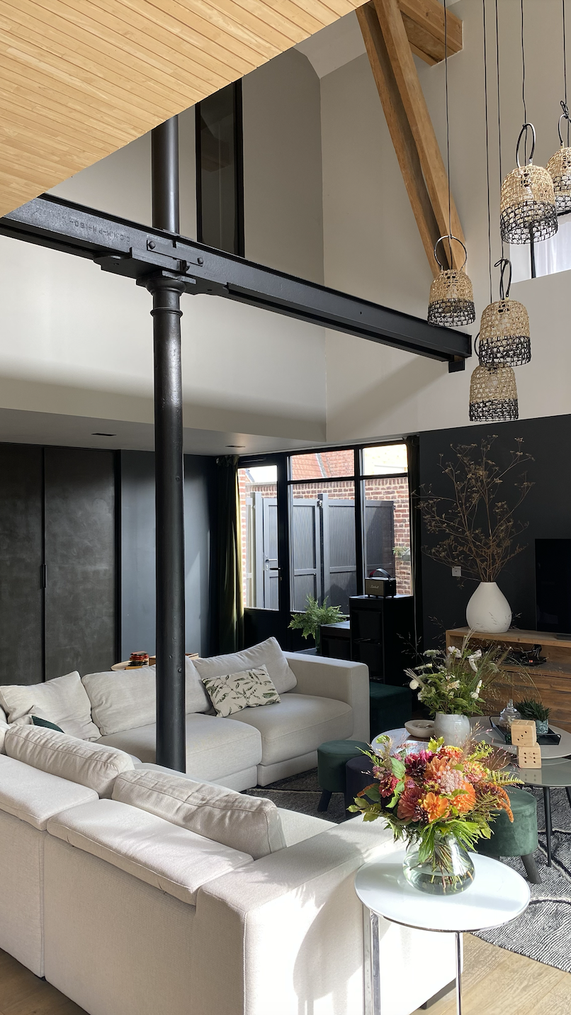 La Grange Graphite, c’est une ancienne grange entièrement repensée dans un esprit architectural fort et lumineux. Une pièce à vivre de 53m², baignée de lumière, révèle un savant jeu de contrastes entre poutres métalliques noires, bardage bois clair, cuisine design et hauteur sous plafond spectaculaire. On y trouve également un cellier aménagé de 19m² (parfait comme coin repas pour les équipes), un bureau, et un garage brut de 120m², une toile vierge pour imaginer vos projets les plus ambitieux. À l’étage, la suite parentale de 21m² avec salle de bain attenante et la chambre enfant cosy de 17m² complètent l’ensemble. À l’extérieur : deux terrasses bien orientées, un jardin, et une atmosphère singulière où le charme ancien se marie à la ligne contemporaine.